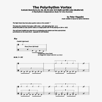 The Polyrhythm Vortex is an etude for one drummer playing 3, 5, 6, 7, 8, 9, 10, 11, 12 with the left hand on the snare while the right hand keeps a steady 4/4 on a cowbell. At the same time the feet on a double bass drum pedal plays in 1/8th notes throughout.